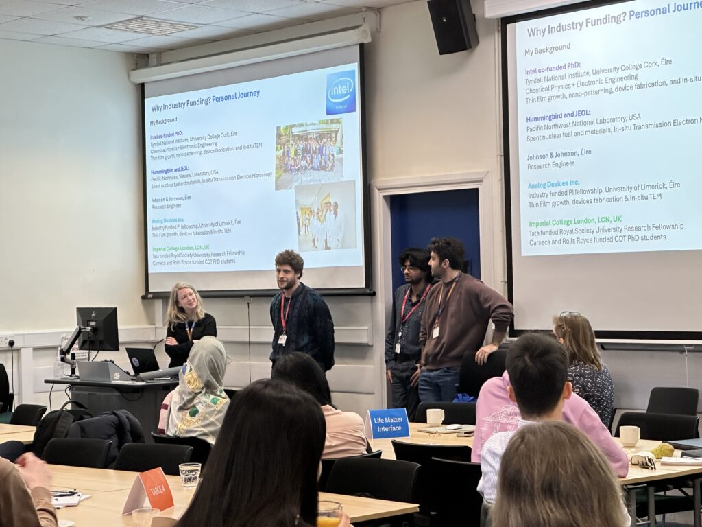 The day kicked off with introductions from LCN Directors Prof Sandrine Heutz and Prof Steven Bramwell.  Dr Shelly Conroy, Associate Professor in Materials at Imperial, then spoke about collaboration with industry through PhD studentships on the Centre for Doctoral Training in Advanced Characterisation of Materials.  Dr Conroy was joined by three doctoral students whose PhDs are sponsored by industry, including Rolls Royce and Cameca. They shared their experiences of industry-sponsored studentships, discussing interactions with industry, project development, challenges, successes and outputs.